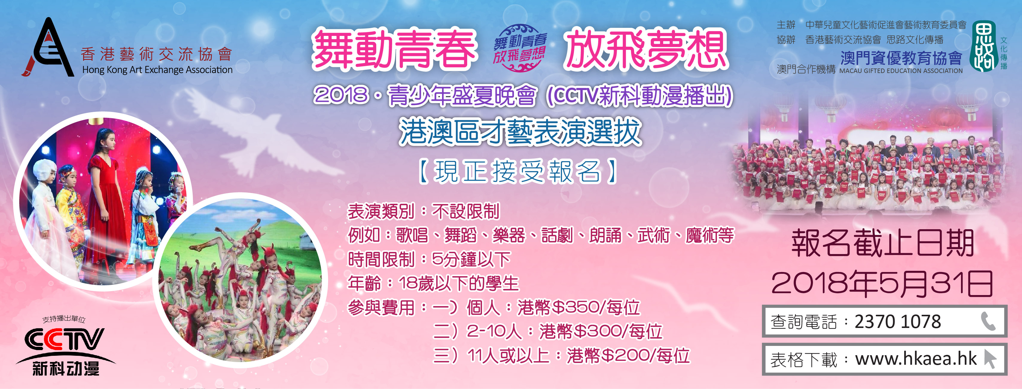 香港藝術交流協會及「思路文化傳播」將協助籌辦“舞動青春 放飛夢想”2018國際青少年盛夏晚會的港澳區才藝表演選拔。
